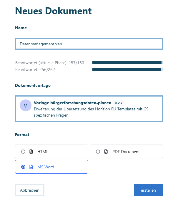 Credit: DLR, CC BY-NC-ND 3.0Sie können Ihren Datenmanagementplan als Dokument herunterladen, das dann beispielsweise für Projektanträge oder Berichte verwendet werden kann. Dafür werden Ihre Antworten als Text in eine deutschsprachige, angepasste Vorlage nach Vorgaben von Horizon Europe eingefügt. Der Datenmanagementplan kann in drei gängigen Dateiformaten heruntergeladen werden: MS Word, PDF und HTML.