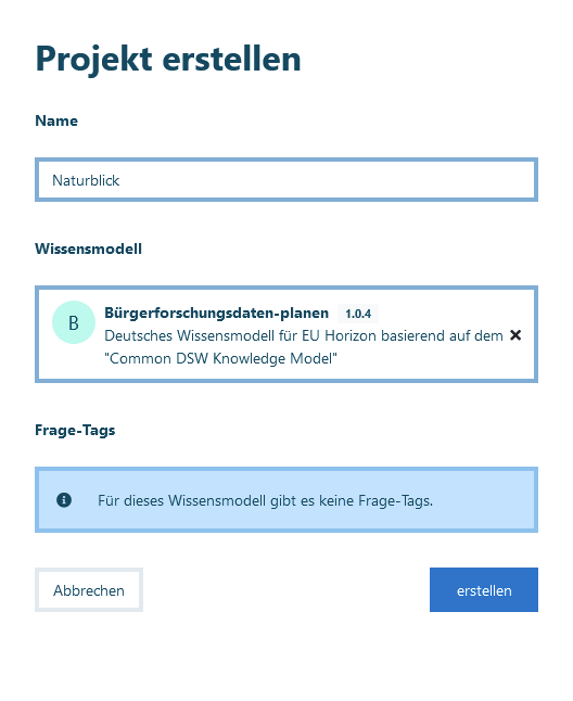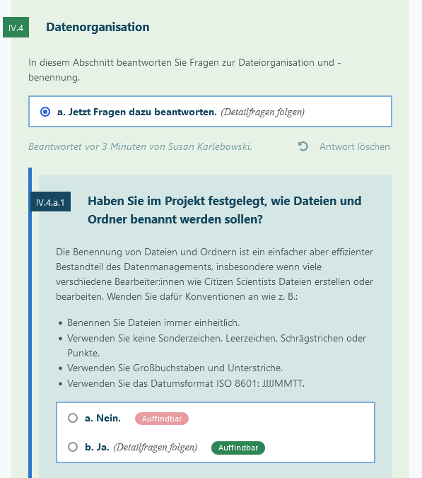 Credit: DLR, CC BY-NC-ND 3.0Beantworten Sie Fragen, die Sie durch verschiedene Themenfelder eines Datenmanagementplans führen. Über das Seitenmenü können Sie das Themenfeld wechseln und sich einen Überblick verschaffen. Basierend auf Ihren Antworten, werden Ihnen nur für Sie relevante Fragen gestellt. Die Fragen können sich daher bei verschiedenen Projekten unterscheiden.