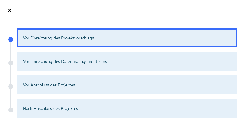 Credit: DLR, CC BY-NC-ND 3.0In jeder Phase eines Projektes sind unterschiedliche Aspekte des Datenmanagements von besonderer Bedeutung. Der Datenmanagementplan ist daher ein lebendiges Dokument, das regelmäßig überarbeitet werden muss. Wählen Sie jeweils die Phase aus, in der sich Ihr Projekt gerade befindet: Vor Einreichung des Projektvorschlags, vor Einreichung des Datenmanagementplans, vor Abschluss oder nach Abschluss des Projektes. Daraufhin werden die wichtigsten Fragen für die jeweils ausgewählte Phase farbig markiert.