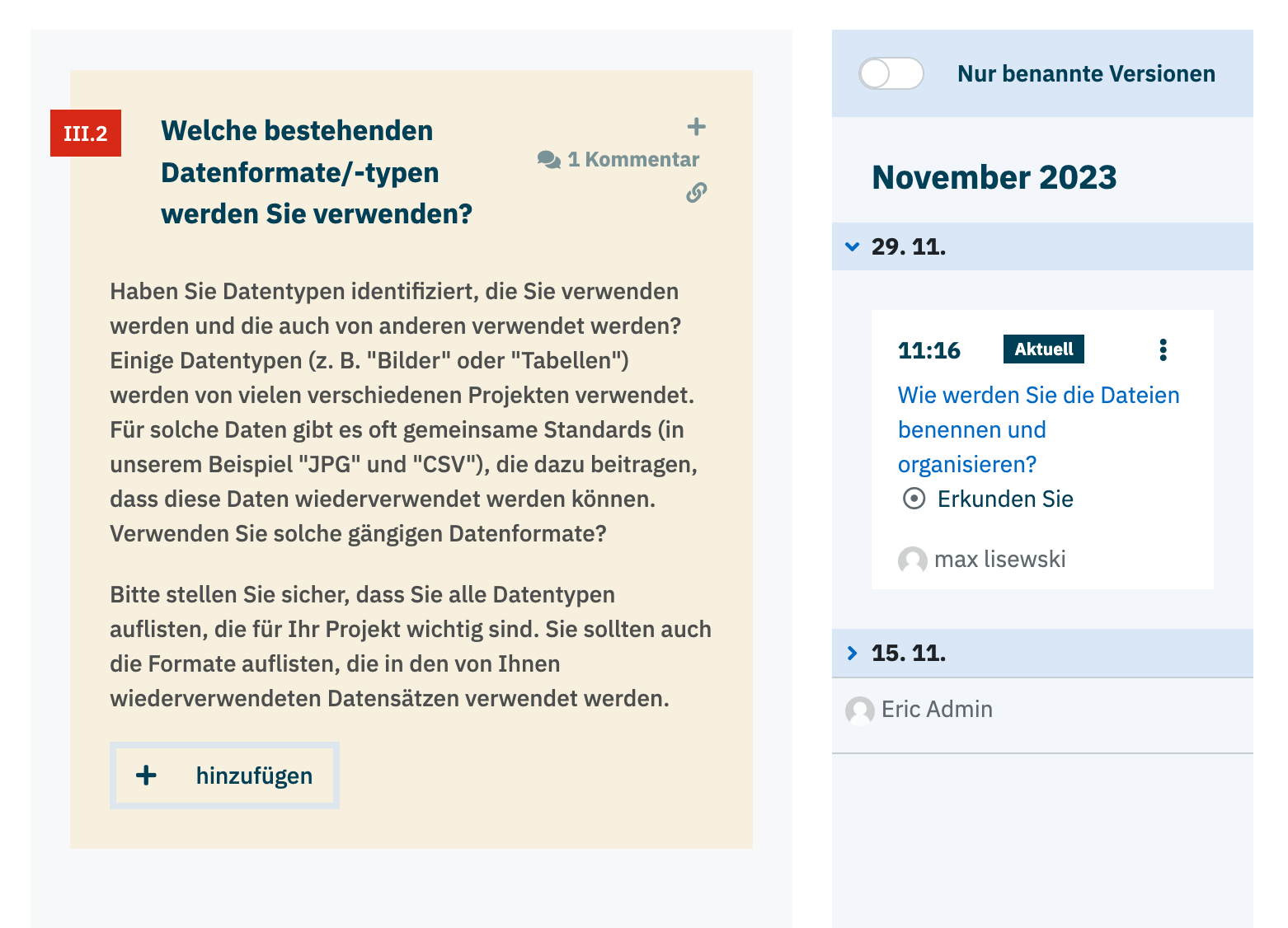 Credit: DLR, CC BY-NC-ND 3.0Jede Ihrer Änderungen im Formular wird gespeichert. So können Sie bei Bedarf darauf zurückgreifen und sehen, wer wann welche Änderungen vorgenommen hat. Dies ist auch hilfreich, falls Sie einmal eine bestimmte Bearbeitungsversion für Ihre Arbeit benötigen.